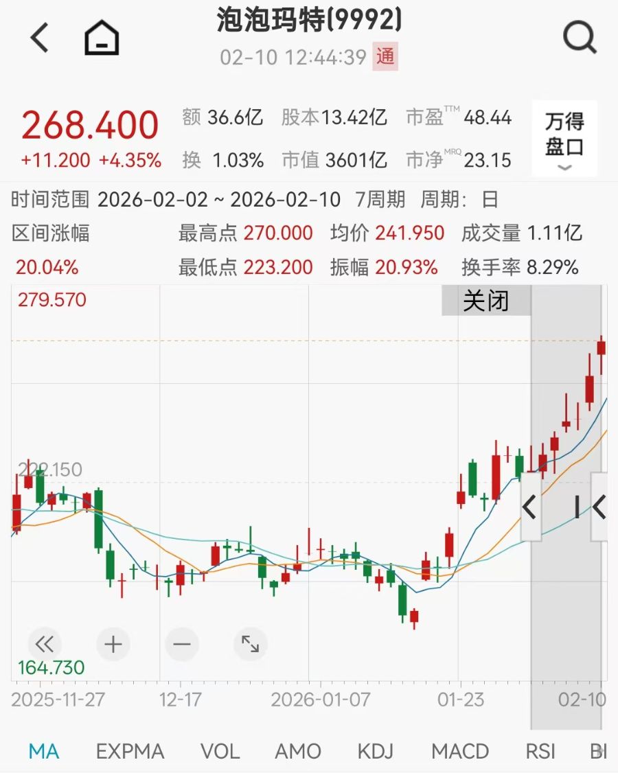 截至午间收盘,泡泡玛特当日涨4.35%,报268.4港元/股,最新总市值为3601亿港元。2月以来,泡泡玛特股价已涨超20%。