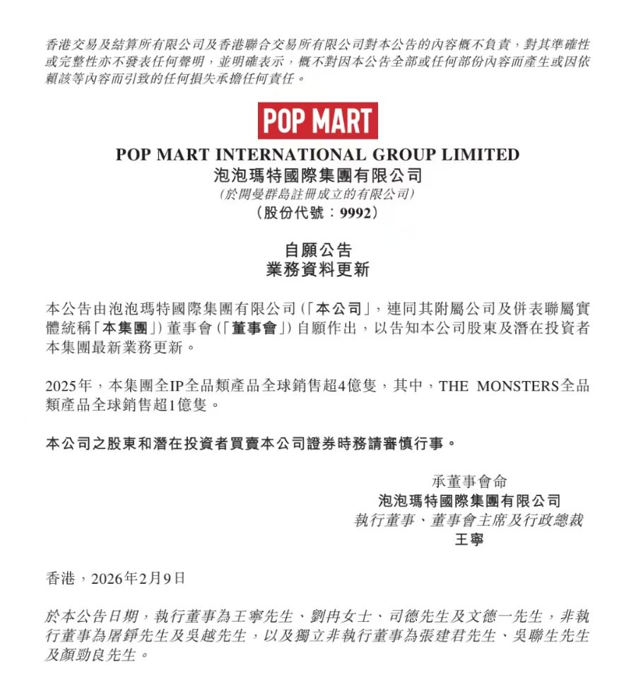 消息面上,2月9日,泡泡玛特向香港联合交易所提交公告,披露2025年全年核心销售数据,全IP全品类产品全球销量突破4亿只,其中THE MONSTERS全品类产品全球销售超1亿只。
